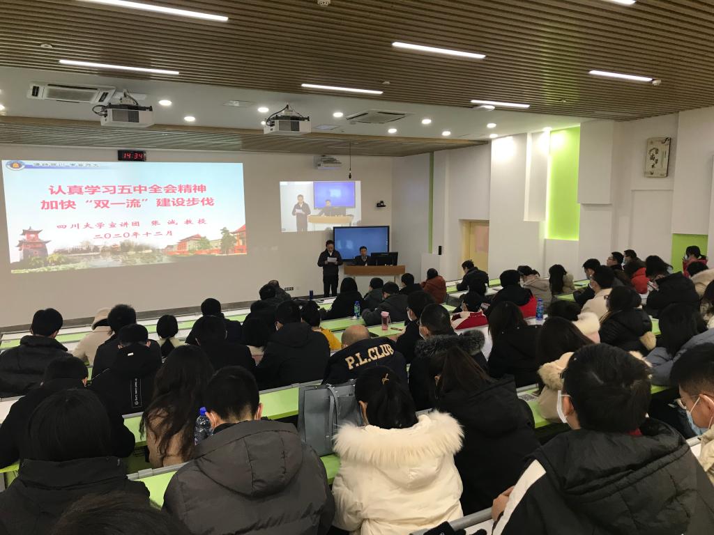 党委于12月18日下午在望江校区基础教学楼C座204教室举行“党的十九届五中全会精神宣讲报告会”,院党委书记尹光福教授主持,特邀学校宣讲团专家张诚教授主讲,学院领导班子成员和师生党员近200人参加了宣讲报告会。