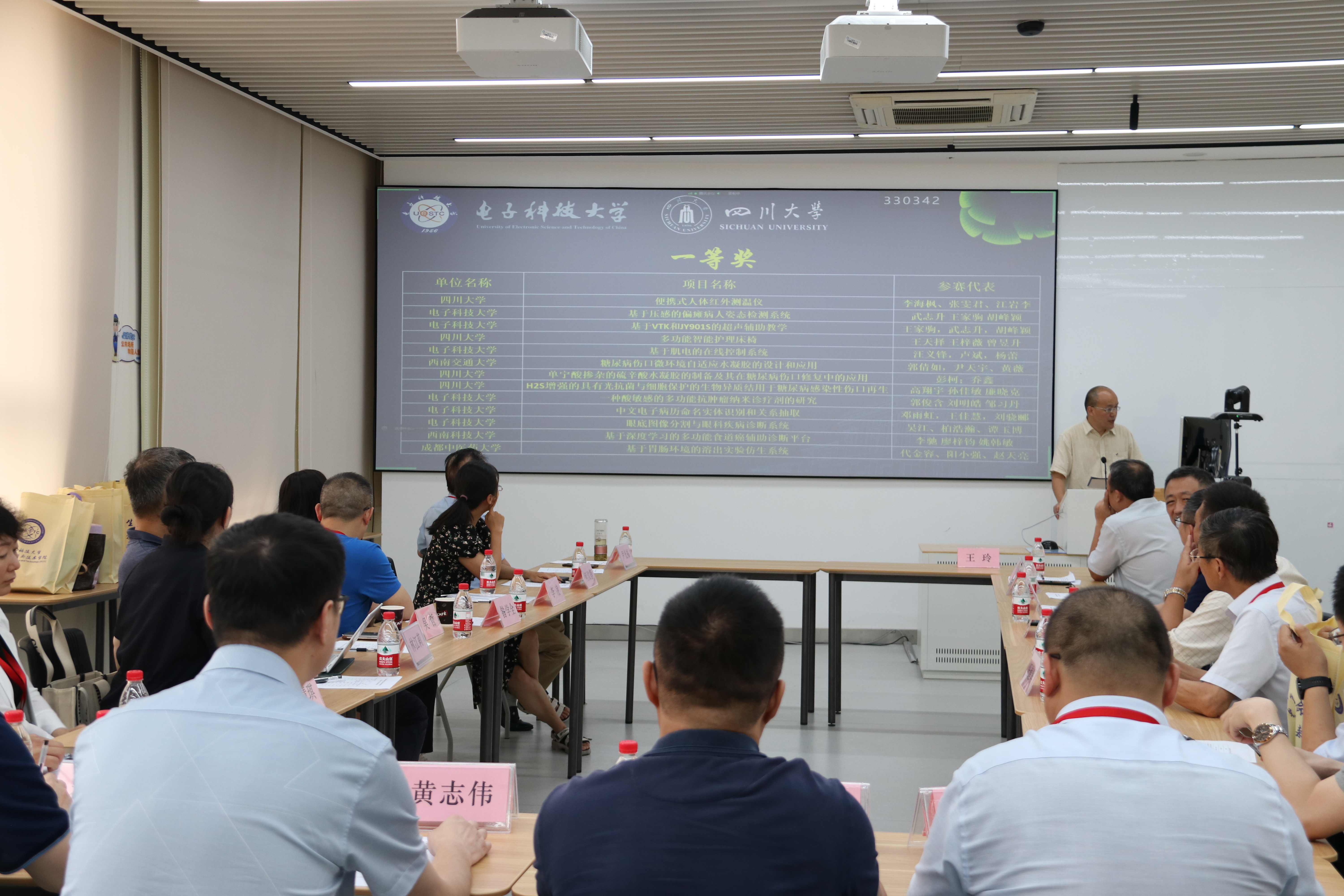 和电子科技大学共同承办,旨在推动我省生物医学工程学科的发展,促进生物医学工程技术的进步,加快专业建设步伐,培养高水平专业人才。本次大赛采取线上线下结合方式,中国科学院院士、教育部高等学校生物医学工程类专业教学指导委员会主任骆清铭在线致辞,电子科技大学副校长孔令讲、四川省生物医学工程类专业教学指导委员会主任尹光福及委员会专家们、电子科技大学生命科学与技术学院院领导线下参会,各高校参赛队伍的指导老师和队员们线上参会。