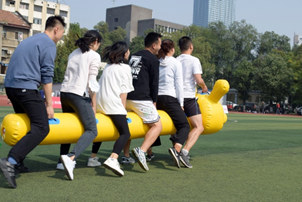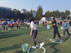 抛球入筐需要老师们将手上的球精确地投入面前的小筐内,不同于投篮,这里的小筐背负在队友的身上,这极大地考验了老师们的默契,老师们需要在心中计算出投掷的力度和高度才能保证小球顺利进入筐内,团队总计数的形式也给比赛增添了更多的配合。老师们一个接一个进球时开心的呐喊、差一点但绝不气馁的鼓励,化作了运动场上最美的交响乐。