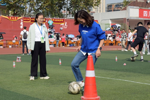 绕杆踢球射门是一种很有趣的比赛项目,它不仅能够考验个人的运动协调能力,还能增强团队之间的凝聚力。绕杆是人对球的控制,需要老师们保证动作的质量和连贯性,射门时老师们也十分注意身体的重心和踢腿的幅度,努力控制球前进的方向和速度。不论是青年组还是中年组的老师,都沉着应战、一丝不苟、努力控制着脚下的足球,灵活穿梭在绿茵场上。