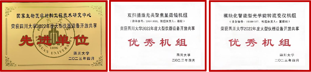 2022年度大型仪器设备开放共享工作中成绩优异,荣获先进单位,双扫描激光共聚焦显微镜机组和模块化智能型光学旋转流变仪机组荣获优秀机组,谭言飞老师荣获先进个人。