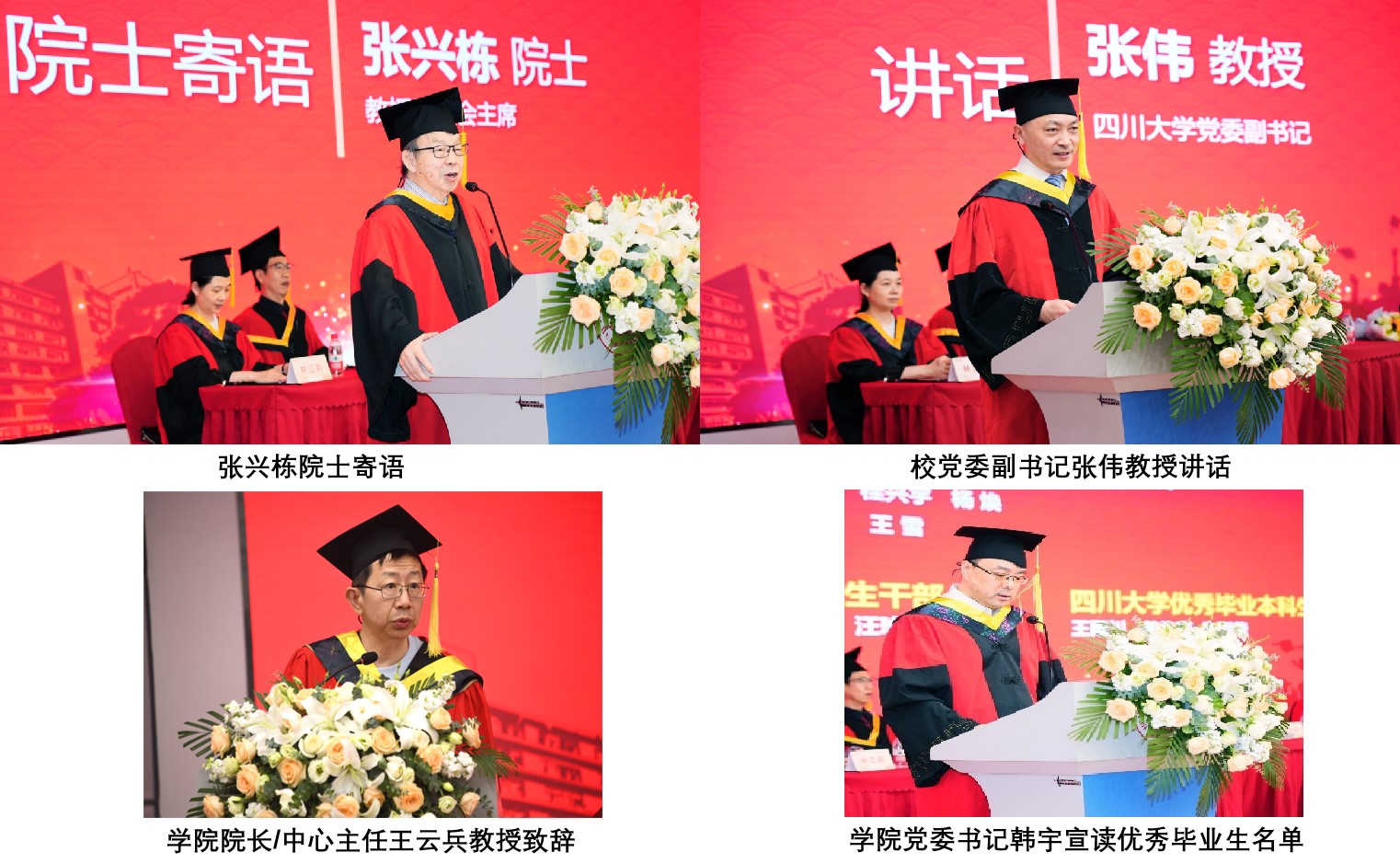 党委书记韩宇、学院院长/国家生物医学材料工程技术研究中心主任王云兵教授、学院副院长林江莉教授,学院/中心艾华教授、蒋青教授、李旭东教授、樊渝江教授、朱向东教授等研究生导师,以及师生代表、毕业生家长代表等出席了典礼。师生们欢聚一堂,掌声雷动,共同见证了学院/中心2023届143位毕业生的毕业盛典。