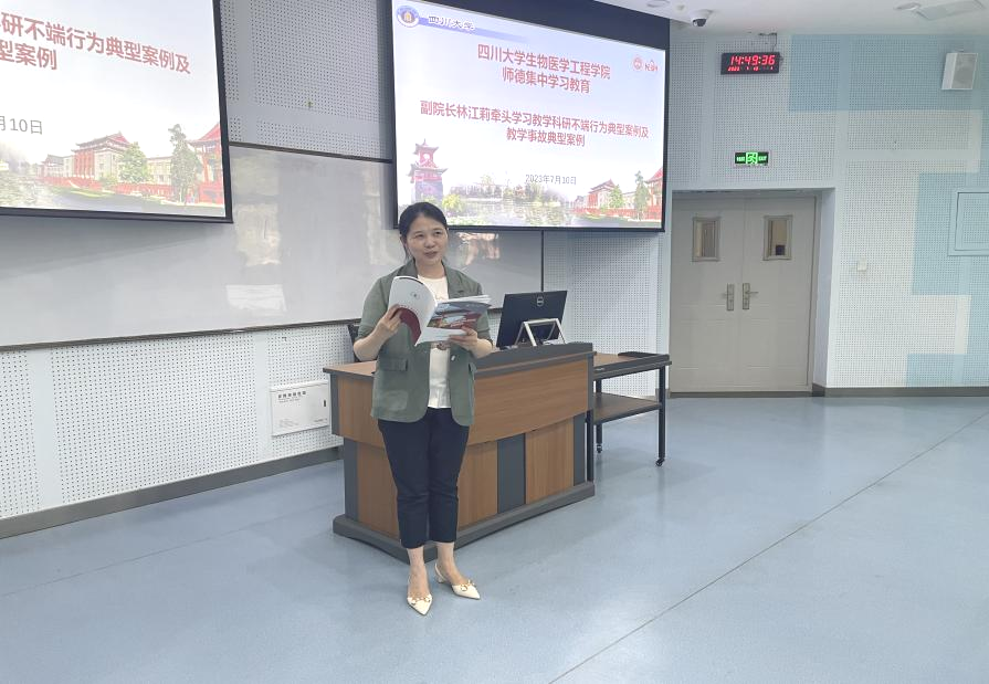 接着,副院长林江莉教授与大家共同学习了教学科研不端行为典型案例及教学事故典型案例。通过一桩桩生动的案例讲解,林江莉副院长勉励全体教职工要为人师表、以身作则;严谨治学、坚守学术良知、反对学术不端,带头践行社会主义核心价值观;弘扬真善美,传递正能量;以新时代高校教师职业行为十项准则严格要求自己,明确师德底线,努力成为有理想信念、有道德情操和扎实学识、仁爱之心的好老师。