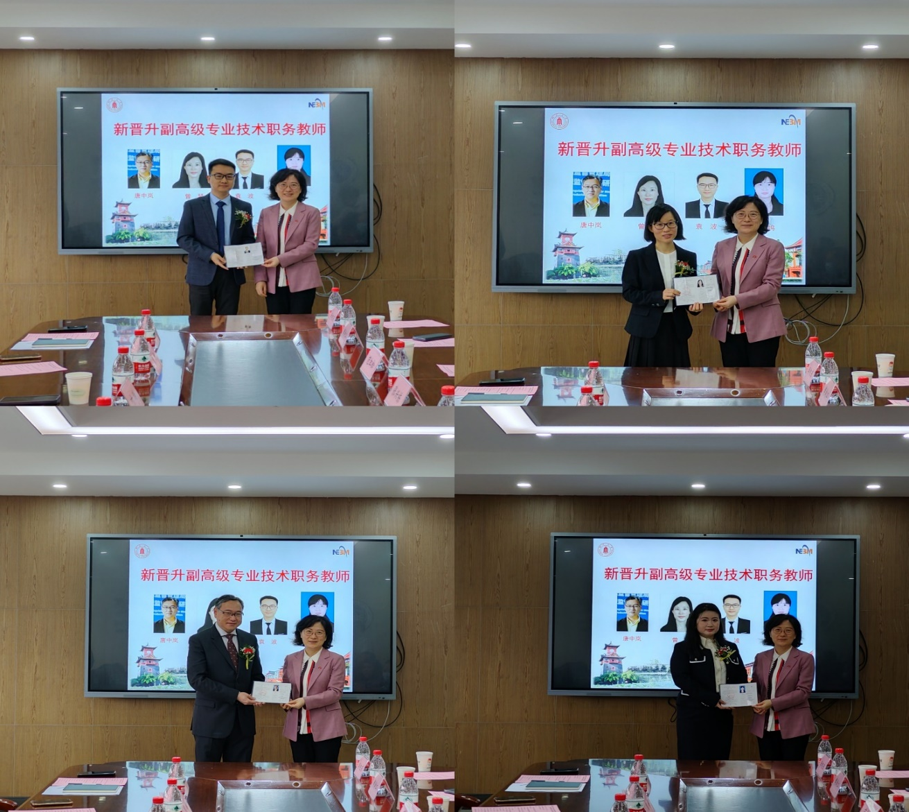 韩宇书记代表学院宣读学校的聘任决定,副校长叶玲为新晋副高级专业技术职务教师颁发聘书。
