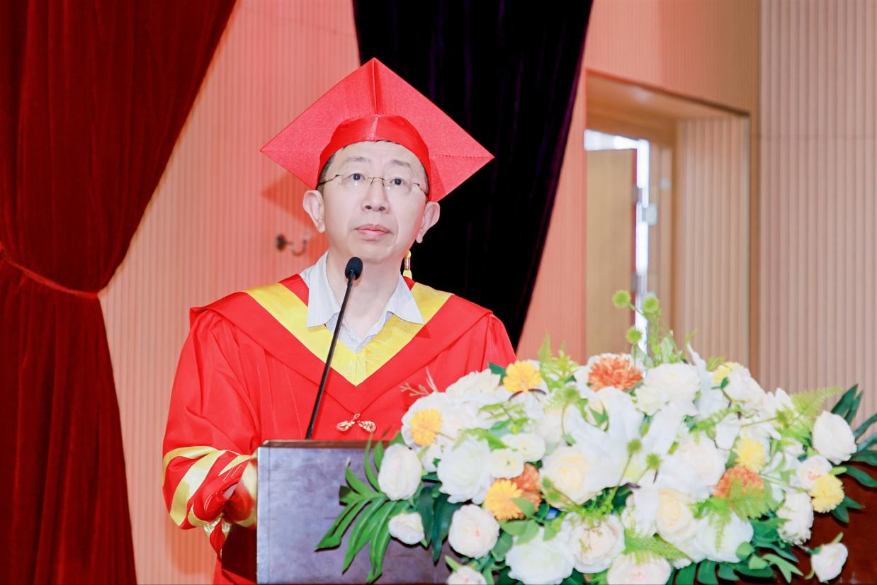 学位授予仪式上,主席台就坐院士、院领导、导师代表等为全体毕业生依次授位,颁发学位证书,并合影留念。