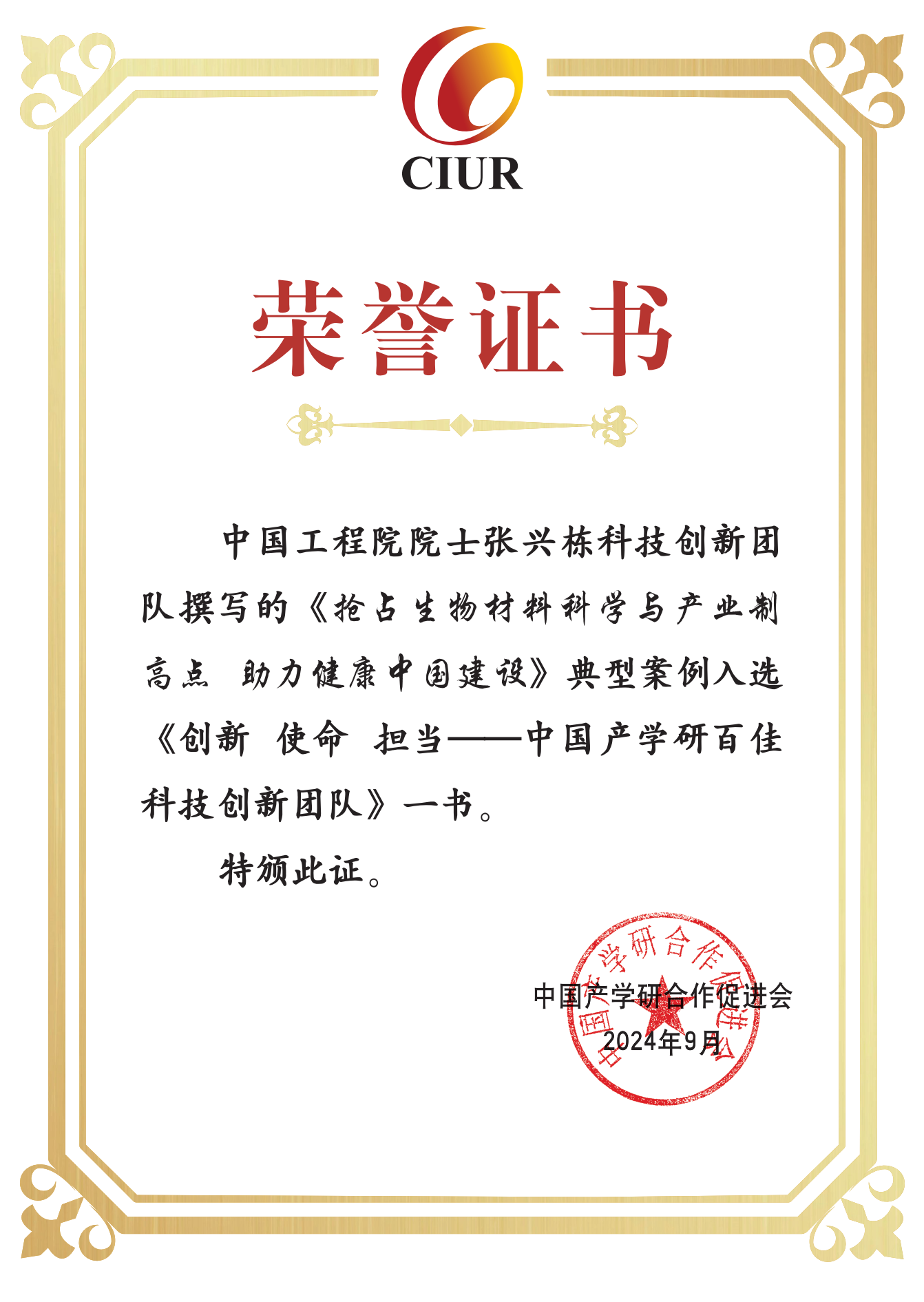 张兴栋院士科技创新团队长期以来致力于生物材料科学与技术的研发与应用,通过持续的创新努力,不仅取得了一系列具有自主知识产权的核心技术,还积极推动产学研合作,将科研成果转化为实际应用,为我国生物材料产业的发展做出了突出贡献。此次入选“中国产学研百佳科技创新团队”,是对团队在科技创新、成果转化及产学研合作方面卓越成绩的肯定。团队秉持创新、使命和担当精神,坚持产学研一体化发展道路,不断推动生物材料科学与技术的创新与应用,助力医疗健康产业的升级与发展,为健康中国建设贡献智慧和力量。