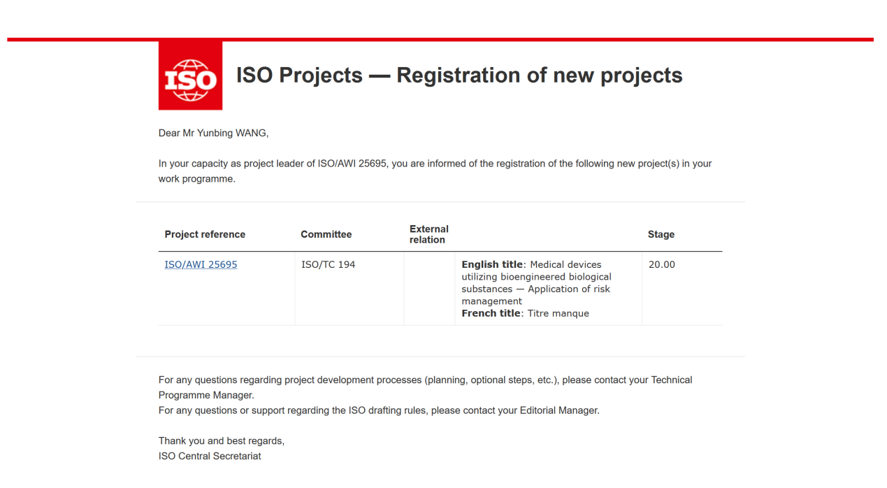和山西锦波生物医药股份有限公司联合牵头的国际标准提案《利用生物工程生物物质制备的医疗器械-应用风险管理》(英文:Medical devices utilizing bioengineered biological substances--Application of risk managemen)正式通过国际标准化组织医疗器械生物学和临床评价标准化技术委员会(ISO/TC194)的立项评审。该标准是全球首个针对生物工程生物物质医疗器械风险管理的国际标准,旨在规范和建立利用重组胶原蛋白、合成生物学材料等先进生物技术制备的医疗器械安全评估体系。哔咔漫画