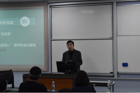 接下来,优秀学生代表马博轩进行了分享。他展示了自己丰硕的科研成果,回顾了自己在学院的成长经历,进行了科研学习的经验分享。他特别提到自己因早进实验室才得到了系统化的科研训练,非常感谢导师和师兄师姐对他的指导,以及中心科研平台对他的帮助。欢迎大家加入创新班,进行专业的科研训练。