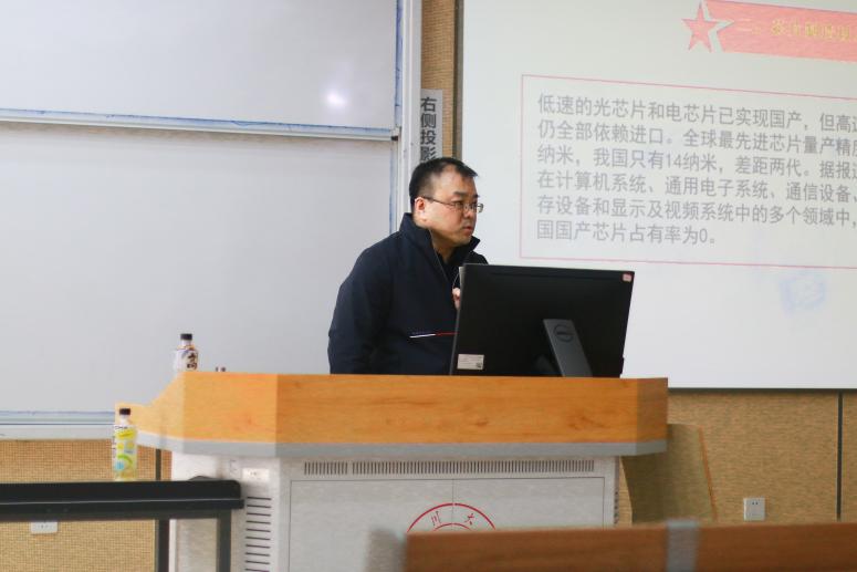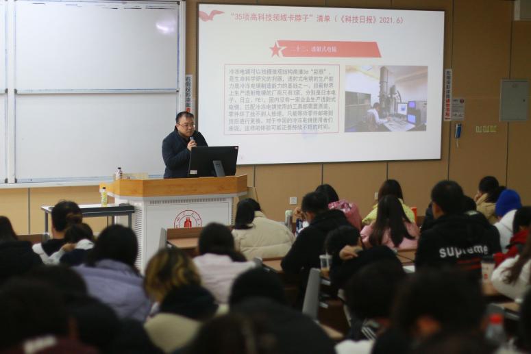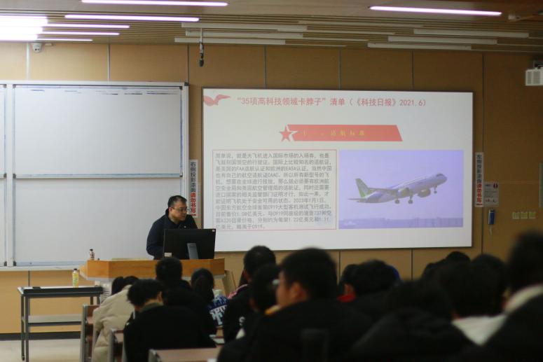 首先,韩宇书记向同学们分享了从习近平总书记对百年来未有之大变局论述的启示。2021年5月28日,在中国科学院第二十次院士大会、中国工程院第十五次院士大会、中国科协第十次全国代表大会上习近平总书记指出:“当今世界百年未有之大变局加速演进,科技创新成为国际战略博弈的主要战场,围绕科技制高点的竞争空前激烈。”通过讲解《科技日报》在2021年6月列出了“35项高科技领域卡脖子”清单,并分享我国近年24项高科技领域实现了从“0”到“1”的重大突破,韩宇书记鼓励同学们科技兴国任重而道远,需要广大有志青年不懈奋斗。
