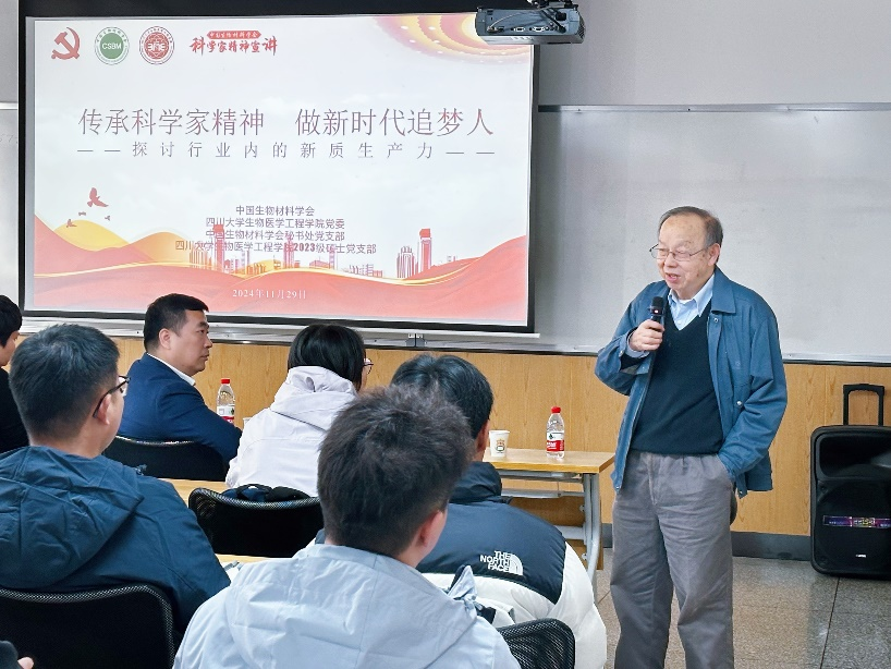2023级硕士生党支部、中国生物材料学会秘书处党支部联合举行题为:“传承科学家精神,做新时代追梦人——探讨行业内的新质生产力” 主题党日活动。本次活动特邀上海纽脉医疗科技股份有限公司董事长虞奇峰博士,立足心脏瓣膜介入器械的创新发展以及未来的发展前景,以该公司的创业实践,对行业内的新质生产力展开深入探讨。活动采用开放式,共有两个支部的党员,学院/中心的师生等近百人参加了报告会。