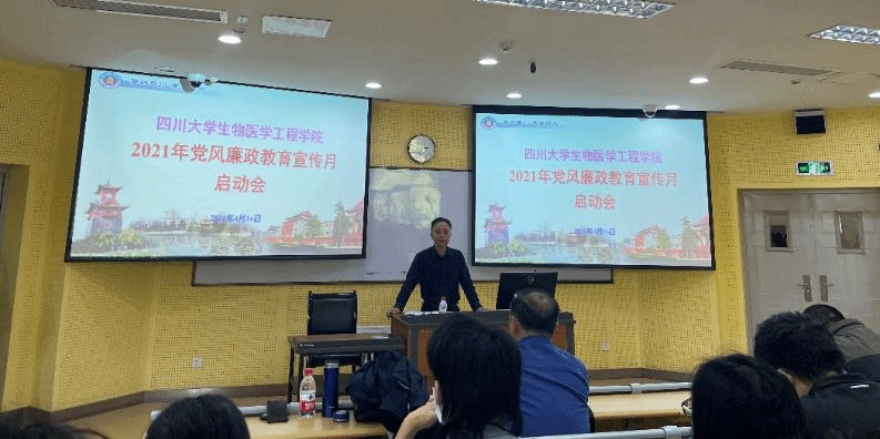 为深入推进全面从严治党和党风廉政建设,进一步贯彻落实《哔咔漫画 2021年全面从严治党工作要点》和《关于开展2021年党风廉政教育宣传月活动的通知》精神,哔咔漫画 于4月16日召开了全院党风廉政教育会。会议以“学党史、践初心,庆百年华诞;守党纪、砺作风,谱一流新篇”主题由学院党委书记尹光福教授主持,学院党政领导班子全体成员、党委委员、纪委委员各支部书记以及师生党员200余人参加了会议。