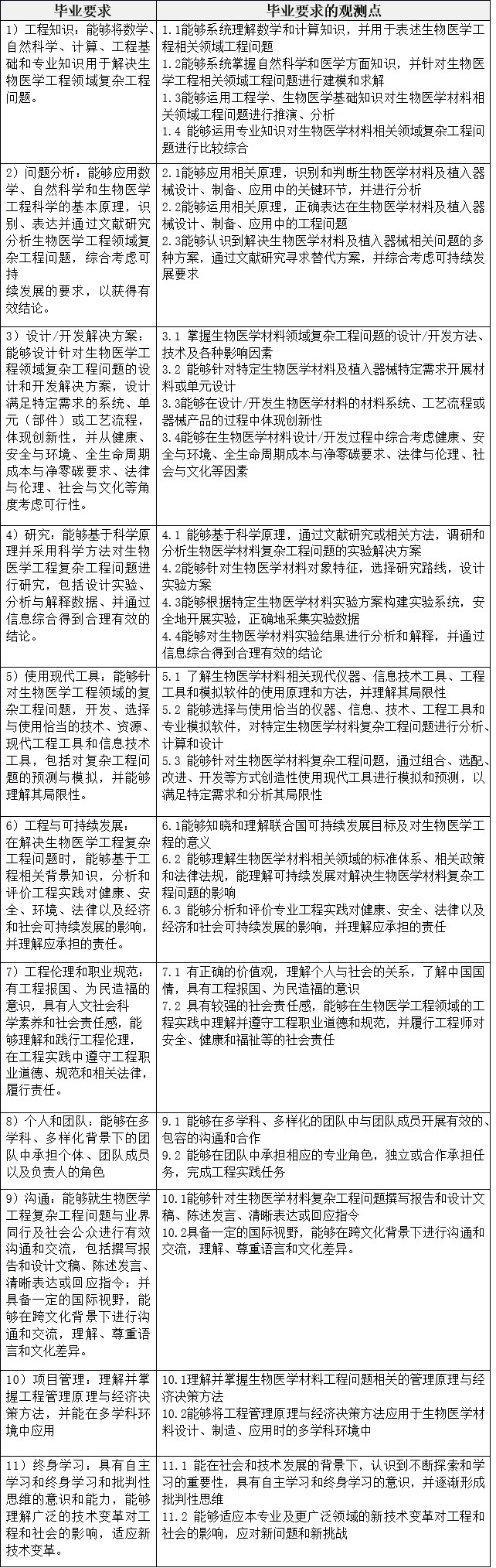 (3)素养:具有良好的人文素养、社会责任感、法制观念及科学素养,满足社会对复合型生物医学材料及植入器械领域技术人才的要求,能够积极服务国家和社会;(对应毕业要求:3、6、7)